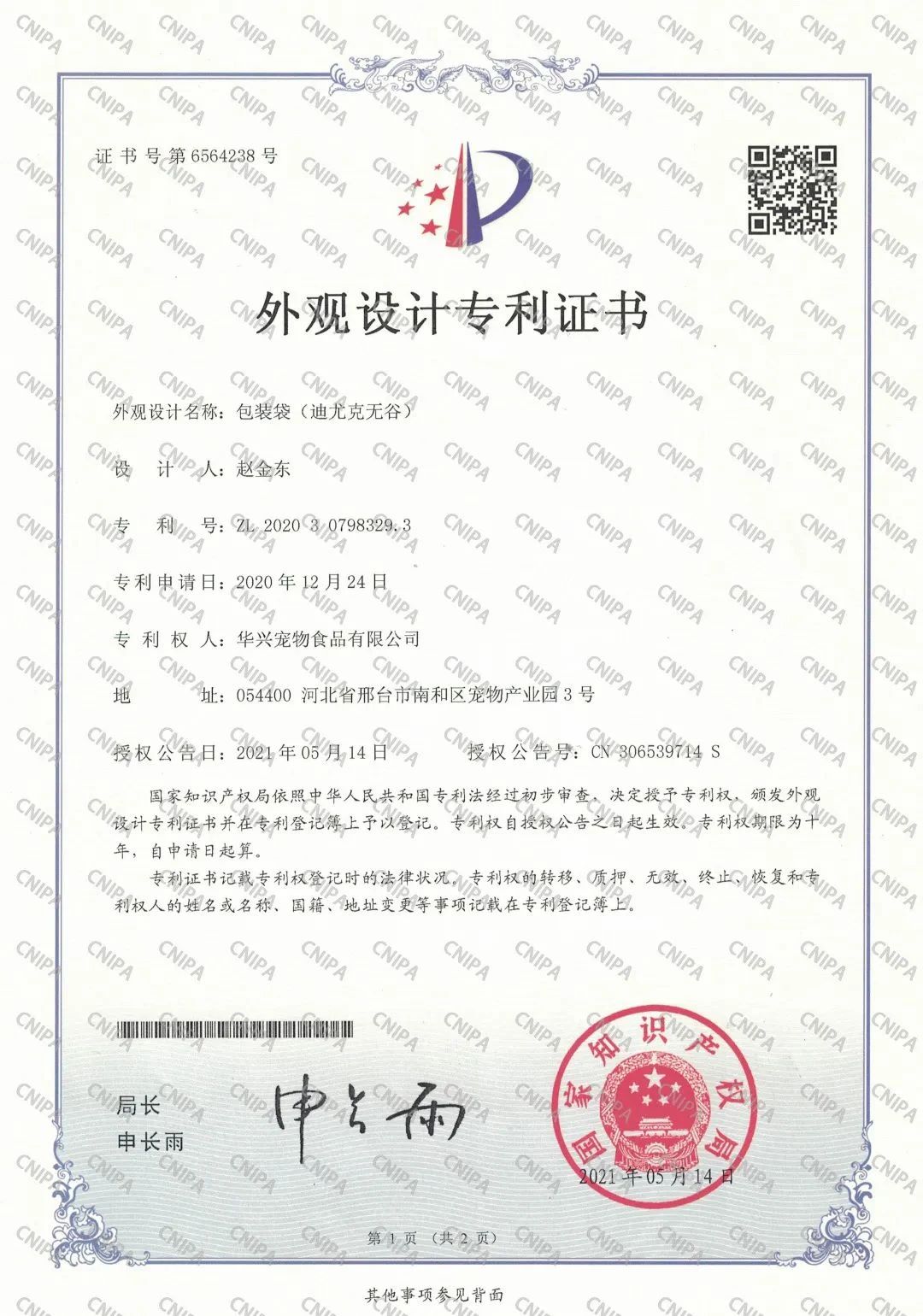 近日,國家知識產(chǎn)權局依照中華人民共和國專利法經(jīng)過初步審查,授予迪尤克無谷包裝袋外觀設計專利證書,專利號:ZL 2020 3 0798329.3,并在專利登記薄予以登記。